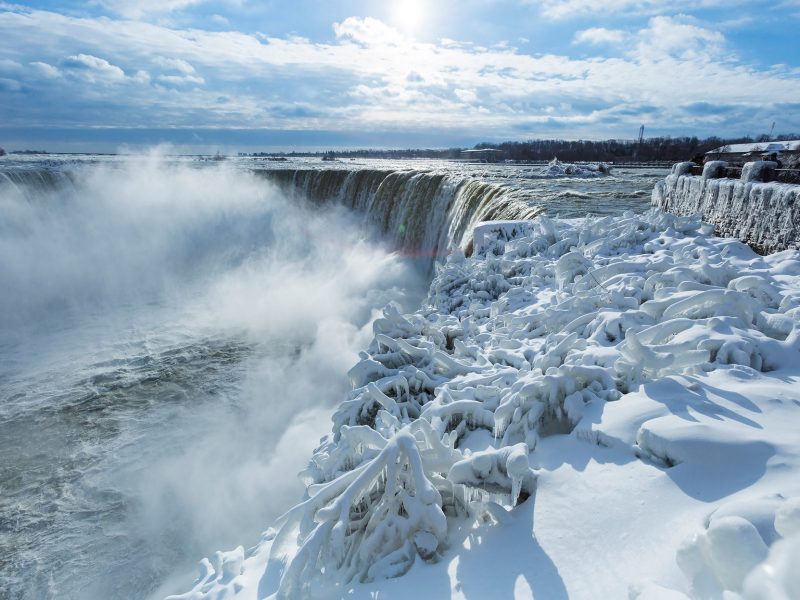 ‘As pessoas estão começando a sentir a mudança climática – está começando a ser algo que é parte de suas experiências pessoais’, diz o professor Matthew Hoffmann, da Universidade de Toronto. Visitantes tiram fotos das Cataratas do Niágara cobertas de gelo, em Niágara, no Canadá Aaron Lynett/Reuters O Canadá está