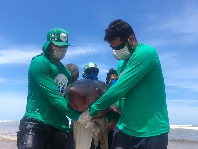 Animal da espécie cachalote-anão apresentava ferimentos superficiais e foi resgatado e medicado pelo Instituto Biota. Baleia encontrada encalhada em Feliz Deserto é resgatada e medicada por equipe do Instituto Biota Um baleia adulta, de aproximadamente 2,5 metros, encalhou nesta sexta-feira (22) no município de Feliz Deserto. Ela foi resgatada com