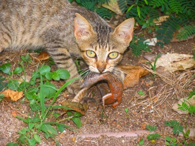 Levados à ilha por humanos a partir de 1737, felinos se multiplicaram e passaram a atacar aves e lagartos ameaçados de extinção. Gato feral predando uma mabuia, lagarto que só existe em Fernando de Noronha Divulgação Eles começaram a ser domesticados há cerca de 10 mil anos e hoje são