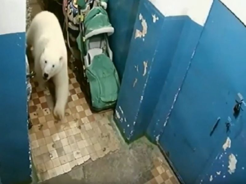 Aquecimento global derrete gelo do Polo Norte, forçando ursos a passarem mais tempo em terra, onde competem pela comida. Animais invadem prédios e perseguem habitantes em localidade de 3 mil habitantes. Ursos polares estão circulando por Novaya Zemlya, no norte da Rússia, levando as autoridades a declarar emergência Reprodução/Youtube/Anna Liesowska
