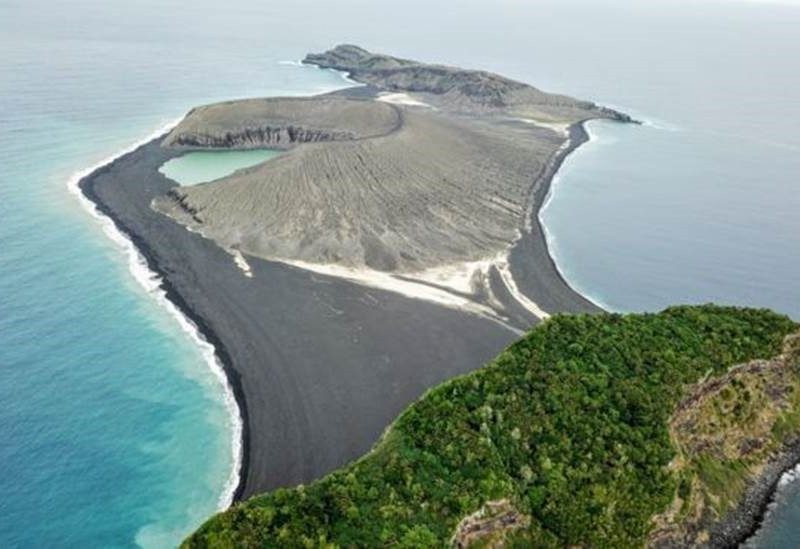 A ilha surgiu em 2015 após uma erupção vulcânica no arquipélago de Tonga. Um grupo de cientistas e estudantes visitou o local pela primeira vez e encontrou um cenário diferente do que esperava. A nova ilha, no centro da imagem, surgiu de uma erupção vulcânica em 2015 Woods Hole “Parecíamos