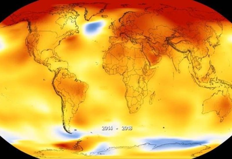 Previsões do Met Office, serviço metereológico do Reino Unido, indicam que período de 2014 a 2023 será a década mais quente em 150 anos de registros. Gráfico da Nasa mostra anomalias na temperatura global entre 2014 e 2018 — as temperaturas superiores a tendências de longo prazo são mostradas em