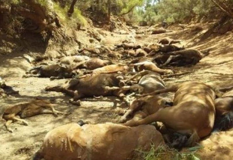 Dezenas de animais foram encontrados agonizando ou já mortos em um poço seco perto da cidade de Alice Springs, em meio à onda de temperaturas recordes no país. Cerca de 40 animais já haviam morrido de desidratação e fome; outros foram encontrados agonizando e acabaram abatidos Ralph Turner Uma onda