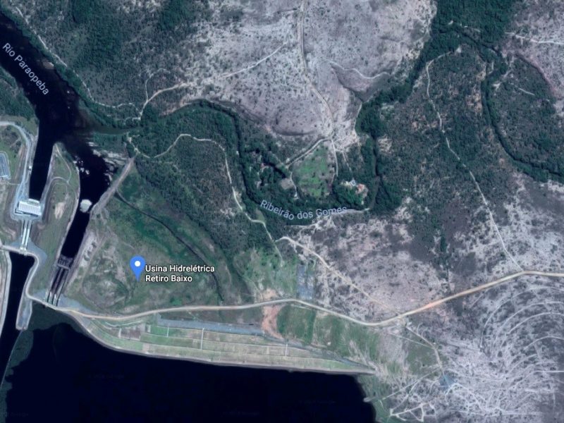 Estimativa da ANA é de que rejeitos atinjam a barragem da usina hidrelétrica em cerca de 2 dias. Barragem da Vale se rompeu nesta sexta (25) e mar de lama avançou sobre casas na área rural. Imagem de satélite da usina hidrelétrica de Retiro Baixo, em Minas Gerais Google Maps