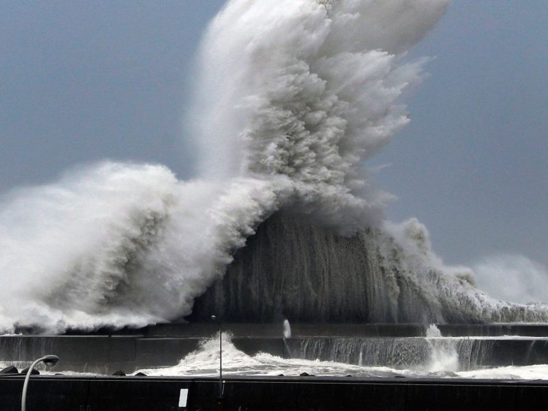 Em estudo publicado nesta quarta (16), pesquisadores chineses e americanos afirmam que as águas do planeta atingiram as temperaturas mais altas nos últimos 60 anos. Ondas atingem barreira em porto de Aki, província de Kochi, enquanto tufão Jebi se aproxima do Japão na terça feira, 4 de setembro de 2018.