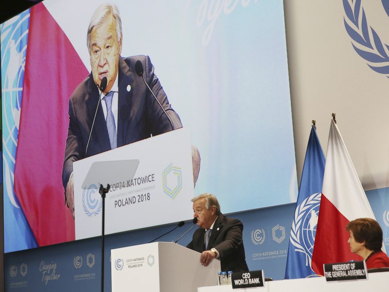 Presidente polonês afirmou que o país “nunca vai desistir do carvão”. A Polônia sedia a Conferência do Clima, que vai até o dia 14. Secretário-Geral da ONU, Antonio Guterres, discursa no segundo dia da COP24, nesta segunda (3). AP Photo/Czarek Sokolowski O secretário-geral das Nações Unidas, o português António Guterres,