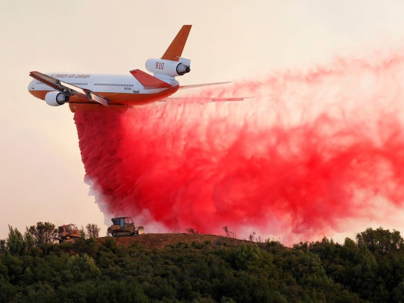 Um avião DC-10 despeja retardador de fogo ao longo do topo de uma colina para proteger dois tratores que estavam na direção do incêndio florestal no complexo de Mendocino, perto de Lakeport, na Califórnia, EUA Fred Greaves/Reuters Os pitorescos condados de Napa e Sonoma, na Califórnia, são dois dos lugares