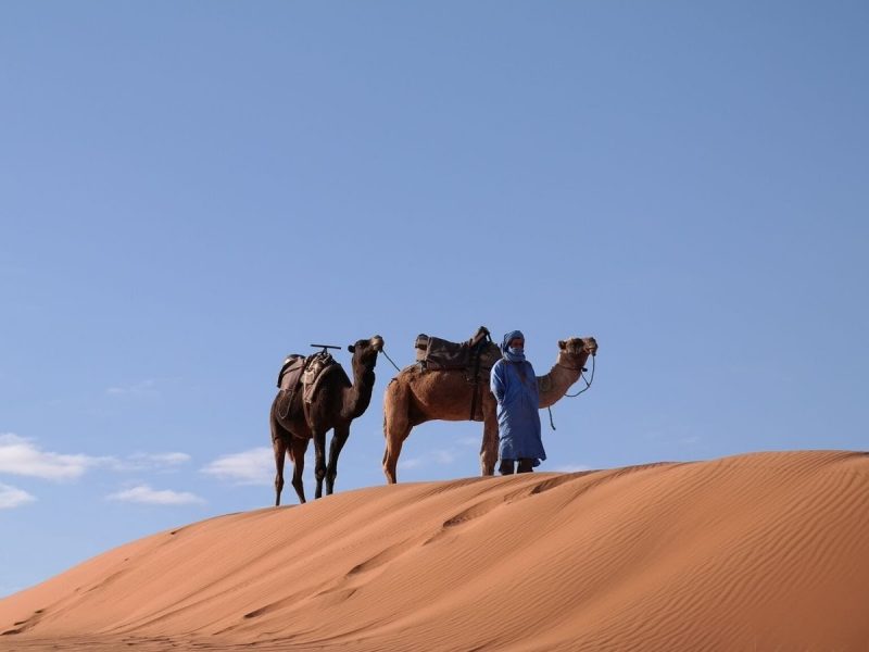 Inspirado em inseto, o besouro-da-namíbia, acadêmico americano apresenta projeto de objeto que colhe partículas de água da atmosfera, mesmo em regiões desérticas, usando nanofibras. Camelos e homem em trajes típicos contra o deserto sobre duna no Saara marroquino TV Globo/Reprodução Em um cenário contemporâneo marcado por aquecimento global e sucessivas