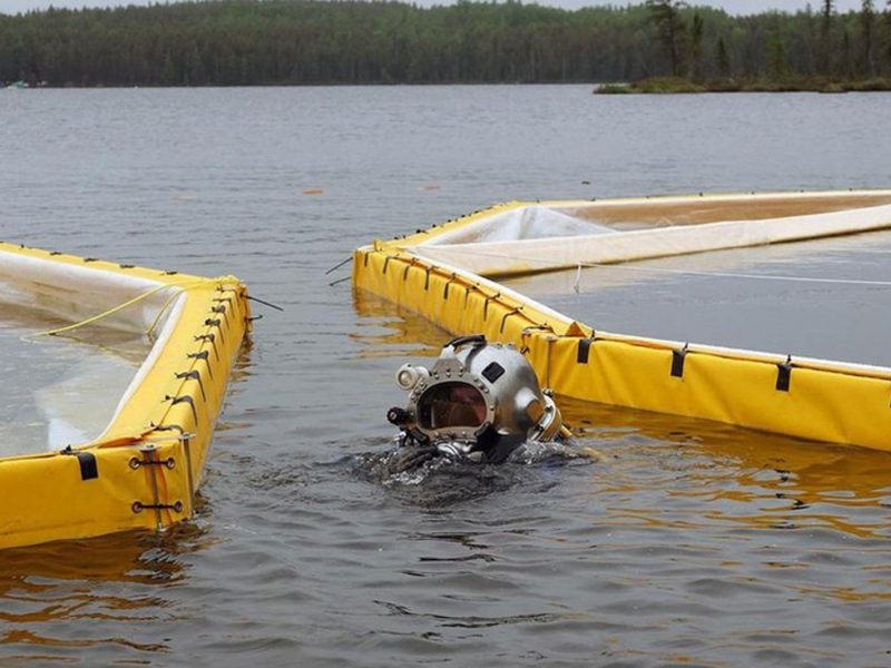 Pesquisadores estão ‘poluindo’ um lago em Ontário, no Canadá, para entender como vazamentos de óleo afetam ecossistemas de água doce. Mergulhador coloca sacos de areia debaixo d’água para proteger o local onde será realizado o experimento BBC/Lesley Evans Ogden É raro que um derramamento de óleo na natureza seja algo