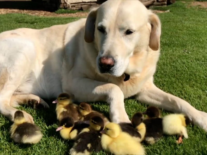 Patinhos foram encontrados sem a mãe em castelo; labrador Fred, de dez anos, passou a cuidar deles. Patinhos foram adotados por um cachorro na Inglaterra BBC Nove patinhos encontrados sem a mãe ganharam um novo – e improvável – pai na Inglaterra. Assista ao vídeo. Os filhotes foram adotados pelo