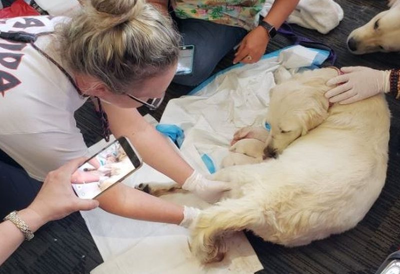 A labradora Ellie entrou em trabalho de parto inesperadamente pouco antes do horário do voo de seus donos no aeroporto internacional de Tampa, na Flórida Ellie amamenta seus oito filhotes no Aeroporto Internacional de Tampa Reprodução/Twitter Uma cadela-guia entrou em trabalho de parto inesperadamente no meio do Aeroporto Internacional de