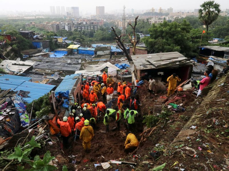 Dezenas de pessoas estão desaparecidas no estado de Maharashtra, no oeste do país. Chuvas intensas também bloquearam várias estradas e fizeram o rio Vashishti transbordar. Equipes de resgate procuram por sobreviventes após desabamento de uma casa devido a um deslizamento de terra em meio a fortes chuvas em Mumbai, na