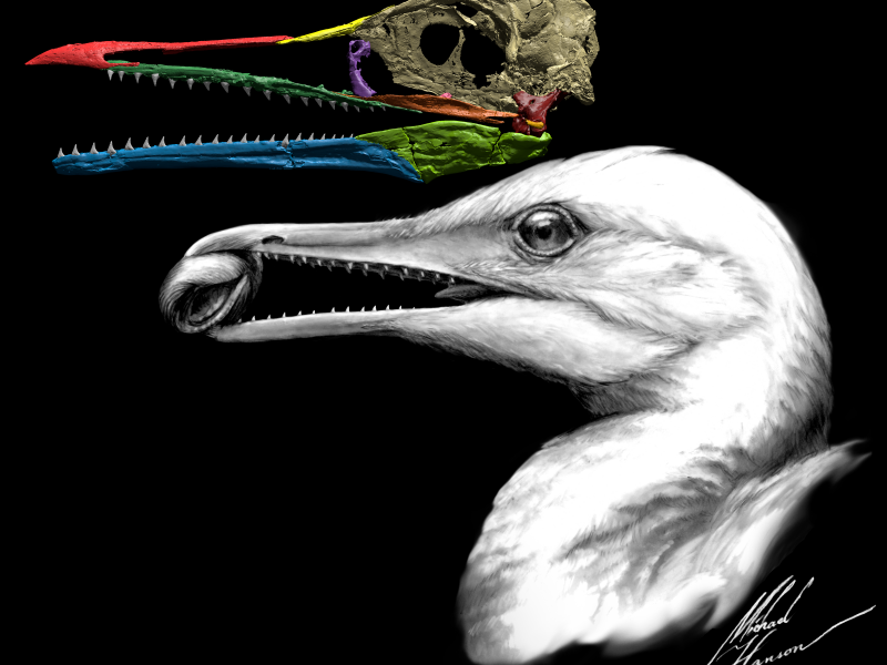 Quatro novos fósseis de um pássaro reforçam teorias de que aves teriam evoluído a partir de alguns dinossauros. Achados foram publicados na ‘Nature’ desta quarta-feira (2). Representação do fóssil encontrado e a reconstrução feita com auxílio de tomografia; bico surgiu para facilitar a manipulação de objetos e comida, dizem pesquisadores