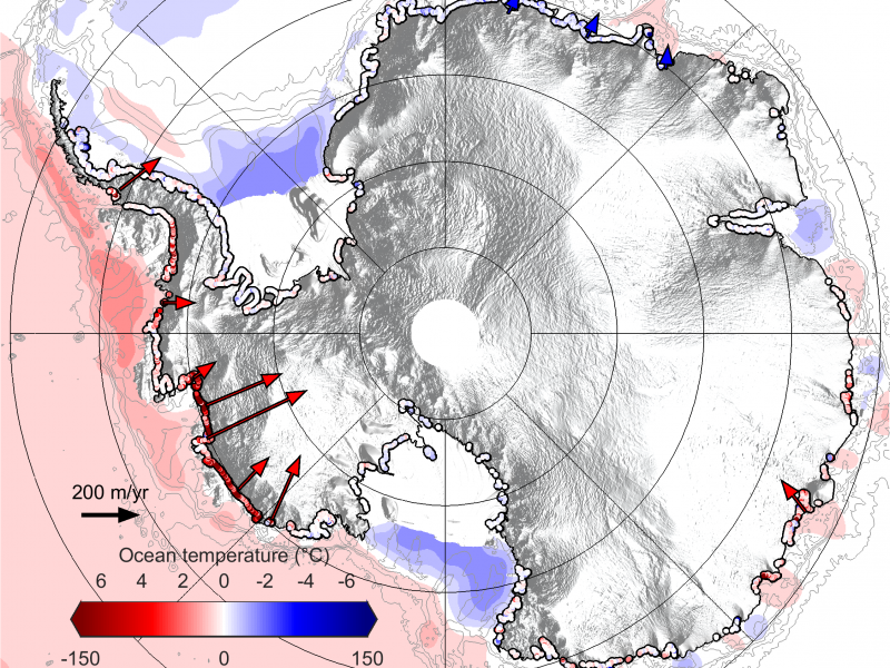 Até agora, região era tida como relativamente estável, mas um novo estudo sugere que a mudança climática atua numa escala muito maior do que constatada anteriormente – e com consequências devastadoras. Ilustração mostra as taxas de migração nas linhas de aterramento ESA Há tempos cientistas mantém ligado o sinal de