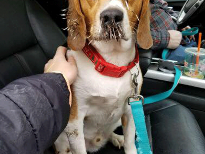 Beagle Milo teve espinhos removidos, já voltou para casa e passa bem. Um cão foi resgatado com ferimentos após fugir de casa e se ferir em contato com porco-espinho no estado americano de New Hampshire. O grupo de resgate Granite State postou fotos do beagle Milo antes e depois da