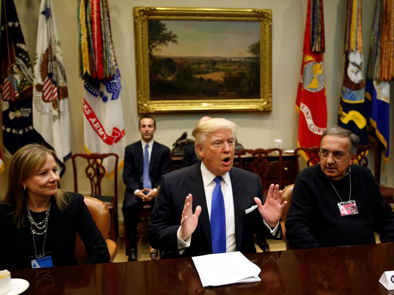 Agência federal diz que objetivo estabelecido para 2025 ‘não condiz com a realidade’. Ideia era que carros fizessem, em média, 21 km/l. Ainda não foram divulgados novos padrões. CEO da GM, Mary Barra (esq.), e da FCA, Sergio Marchionne (dir.), se reuniram com Trump em janeiro de 2016. Na época,