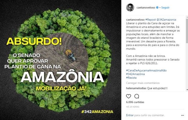 Projeto de lei que permite cultivo em áreas degradadas da floresta será votado nesta terça-feira no Senado. Artistas e ambientalistas se mobilizaram nas redes sociais contra projeto de Flexa Ribeiro Reprodução/Instagram Artistas como Caetano Veloso e Marisa Monte publicaram protestos em seus perfis de Instagram: “Absurdo! O Senado quer aprovar