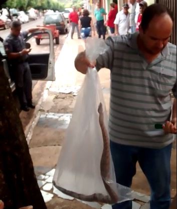 Segundo a polícia, motociclista parou o veículo para ir a farmácia e encontrou o réptil quando voltou. A cobra foi colocada em saco plástico e solta pelos bombeiros na natureza.