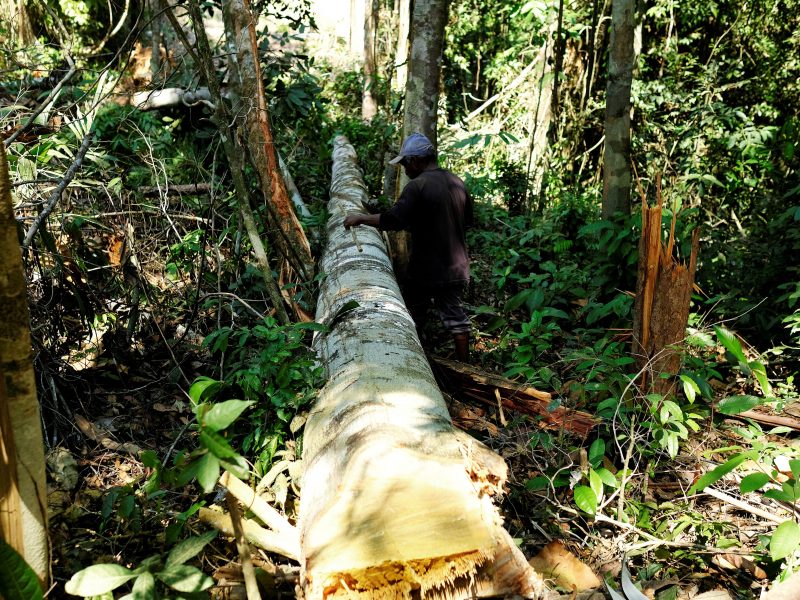 Foram 1.062 km² sob alerta de desmate. É o quarto mês consecutivo em que os índices batem recordes históricos mensais; primeiro semestre de 2021 teve a maior área sob alerta em 6 anos. Foto mostra homem medindo árvore depois de cortá-la em Itaituba, oeste do Pará, no dia 7 de