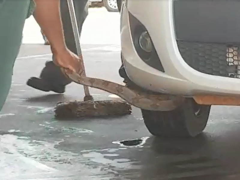 Cobra é resgatada de suspensão de carro em posto de combustíveis