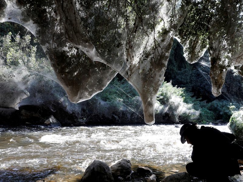 Teias de aranhas gigantes envolvem árvores de floresta em Jerusalém