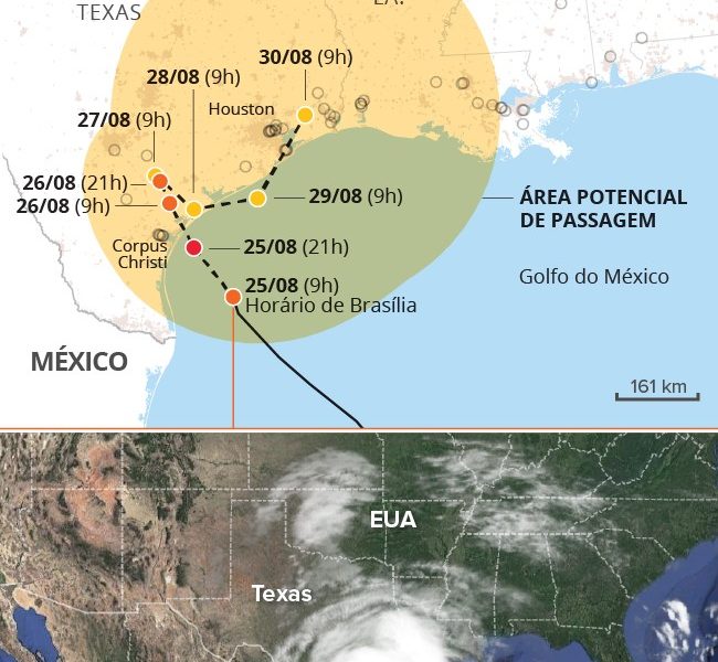 Furacão deve alcançar categoria 3 na sexta-feira, com ventos de até 209 km/h, e pode provocar ‘inundações fatais’, segundo Centro Nacional de Furacões. Governador do Texas lançou alertas de desastre em 30 condados como medida preventiva.
