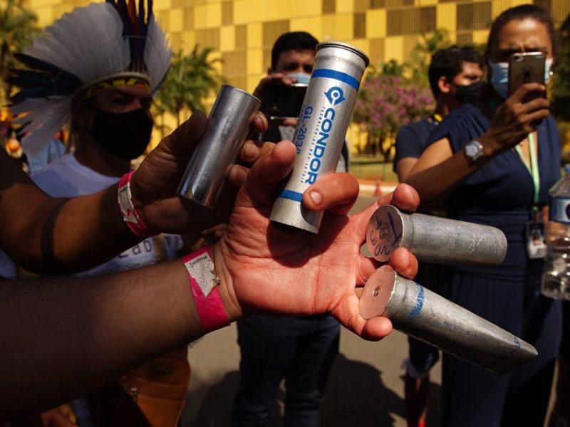 Projeto de Lei 490, de 2007, é fortemente criticado por indígenas e entidades. Proposta prevê que, para ter uma terra demarcada, povos precisam comprovar ocupação em 5 de outubro de 1988, data da promulgação da Constituição Federal. Indígenas mostram capsulas de armamento não letal usado contra os representantes das etnias,