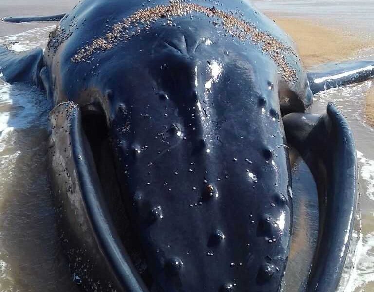 Jubarte tem aproximadamente nove metros de comprimento. Uma equipe já foi até o local e interditou um trecho da praia.