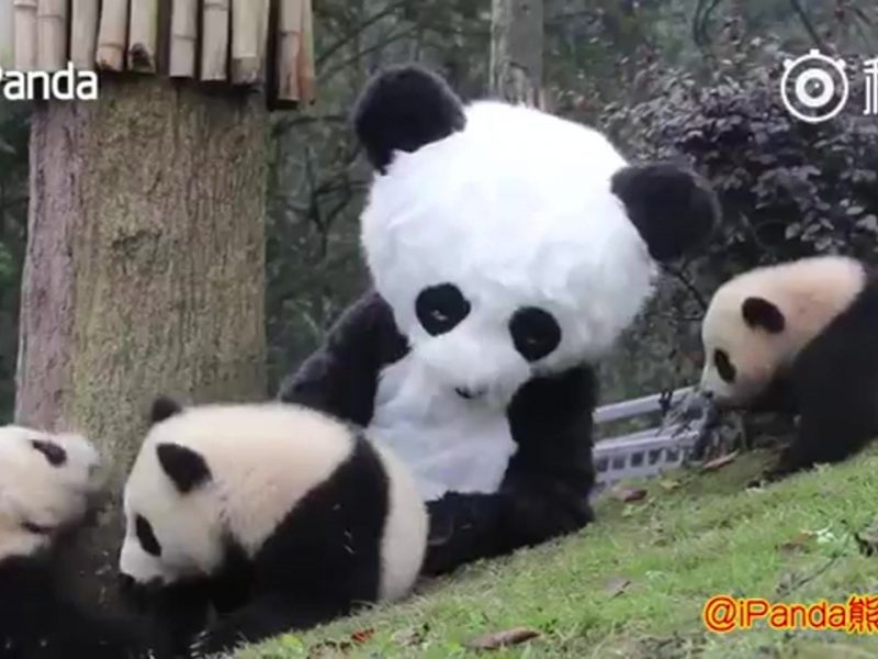 Melhor trabalho do mundo? Tratador se fantasia de panda para virar ‘babá’ de filhotes