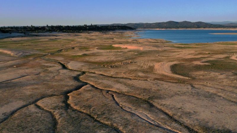 Empresa de pesquisa subaquática encontrou aeronave intacta no fundo de um lago. Em vista aérea, baixo nível das águas é visível no lago Folsom, na Califórnia Justin Sullivan via BBC Num momento em que uma severa seca na Califórnia tem reduzido substancialmente os níveis de água dos lagos em todo