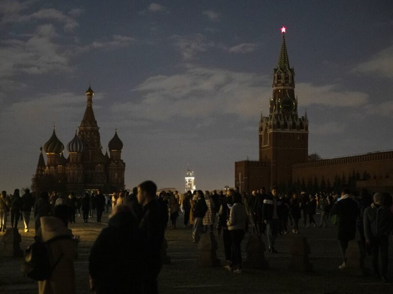 Durante uma hora, grandes construções geralmente bem iluminadas ficam com as luzes apagadas para conscientizar sobre a proteção ao meio ambiente. Visitantes tiram fotos na Praça Vermelha, em Moscou, das luzes apagadas do Kremlin e da Catedral de São Basílio, neste sábado (27), na Hora do Planeta 2021 Pavel Golovkin/AP