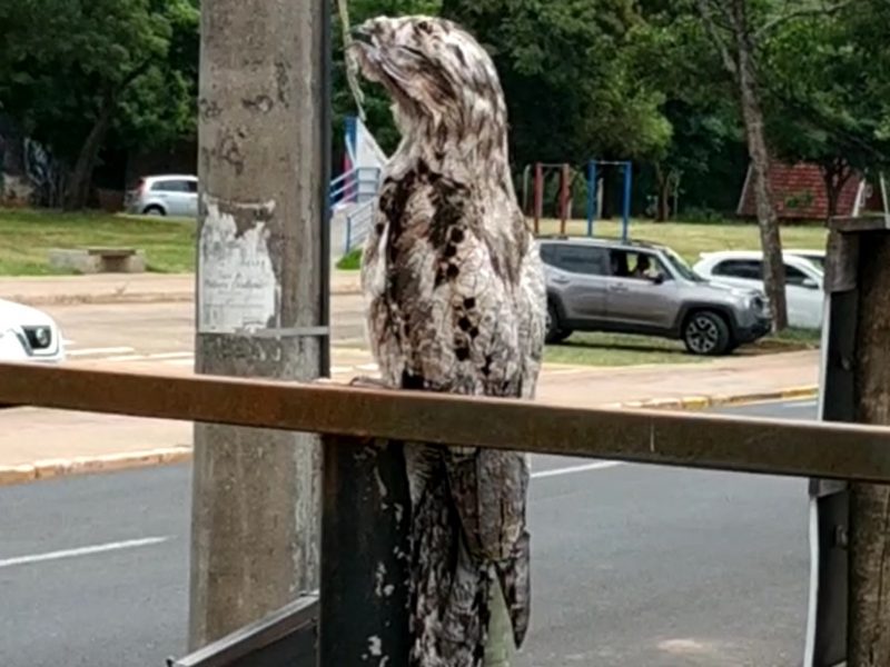 Ave usa as penas para se camuflar em meios às árvores, mas nesta quarta-feira (17) foi vista em um pilar, completamente à vontade. Espécie não apresenta nenhum tipo de risco. Aparição de urutau foi flagrada nesta quarta-feira (17), no Parque do Povo, em Presidente Prudente Ele parece uma estátua de