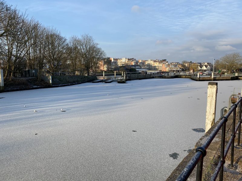Temperaturas chegaram a -2ºC na capital inglesa; frente fria avança do Mar Báltico para o Reino Unido que pode registrar até -15ºC em diversos pontos do norte do país. Trecho do rio Tâmisa no distrito de Teddington, sudoeste de Londres, congelou em 11 de fevereiro de 2021 Reprodução/Twitter/@jamesafisher Uma frente