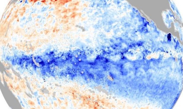 Organização Meteorológica Mundial anuncia que novo episódio de fenômeno provavelmente terá efeito de resfriamento em temperaturas globais. Imagem mostra as águas mais frias do Pacífico que…