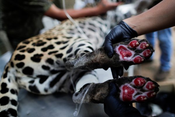 Veterinários ainda não sabem se animal poderá retornar à vida selvagem. Cuidador mostra queimaduras nas patas de uma onça-pintada adulta chamada Amanaci sofrida após um incêndio…