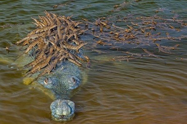 Fotografia que mostra macho da espécie gavial com filhotes é finalista da competição Wildlife Photographer of the Year. Orgulho do pai: filhotes de crocodilo gavial presos…