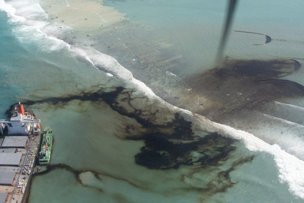 Vazamento de óleo preocupa por possíveis danos à biodiversidade do arquipélago. Óleo que vazou de navio nas Ilhas Maurício, em foto de 12 de agosto Beekash Roopun/L’Express…