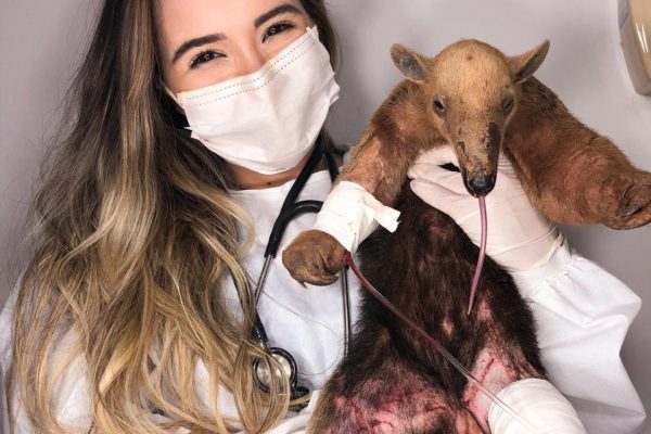 Suspeita é que animal estivesse fugindo de alguma queimada. Linguaruda, como está sendo chamada, foi atacada por um porco-espinho e estava com a pata quebrada. Taís…