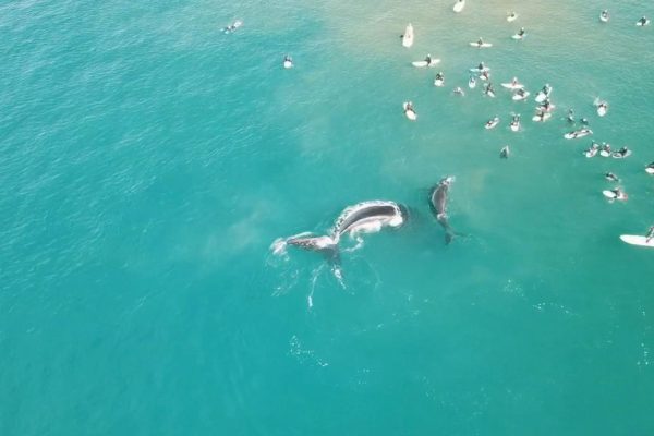 Vídeo mostra momento em que a mãe quase empurra surfistas com a cauda. Baleia franca e filhote nadam bem perto de surfistas em praia de…