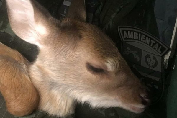 Policial dá leite em mamadeira para filhote de cervo resgatado após entrar em casa em MT; veja vídeo