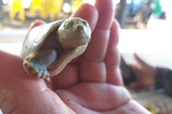 Segundo especialista, espécie nasceu “hipomelânica”, ou seja, com pouca melanina. Encontro ocorreu no último fim de semana no rio Guaporé durante trabalho de devolução de tartarugas…