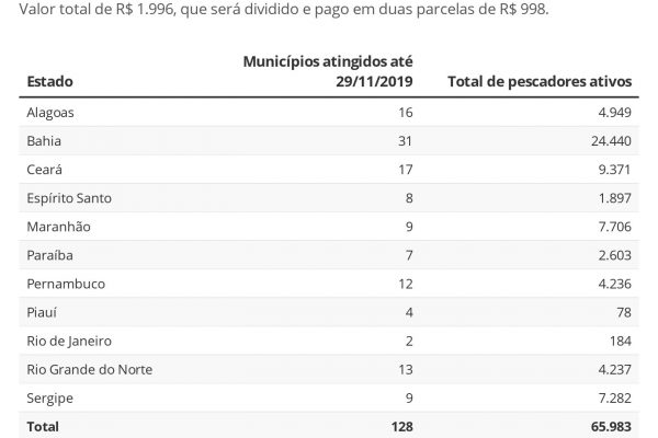 Ministério da Agricultura divulgou o número dos registros dos pescadores beneficiados com a medida. Segundo governo, benefício não interfere no recebimento do seguro defeso. Pescadores do…