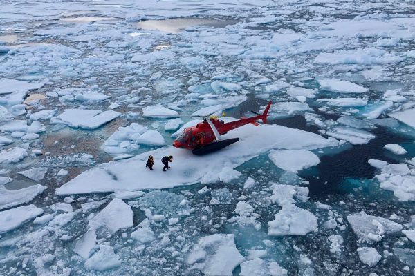 Embarcação encontrou a boia com o dispositivo da pesquisa que acompanhava o som destes mamíferos congelada em um bloco de gelo. Helicóptero do navio sueco Oden…