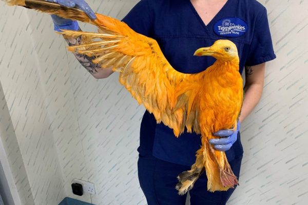 Ave ‘laranja’ é resgatada e veterinários descobrem que era uma gaivota coberta de curry