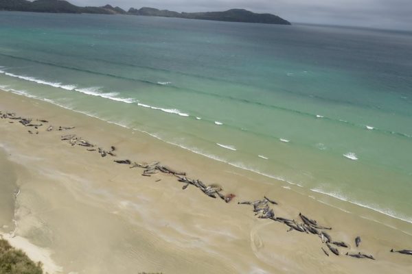 A triste e impressionante fila de 145 baleias encalhadas em praia da Nova Zelândia