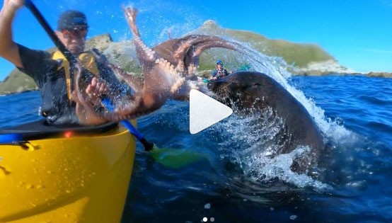 Australiano estava remando em um caiaque, quando foi atingido pelos tentáculos do molusco. Episódio ocorreu na Nova Zelândia. Foca segura polvo no mar e tentáculos…