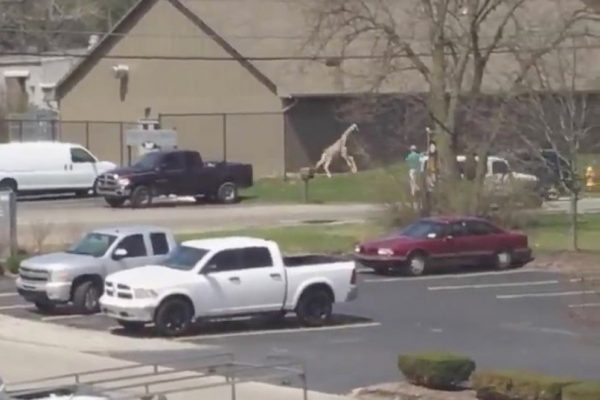 Girafa escapa da jaula em zoológico dos EUA e ‘passeia’ em área próxima a estacionamento