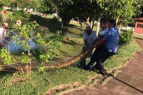 Funcionários resgatam sucuri encontrada em lago de termas de Ibirá