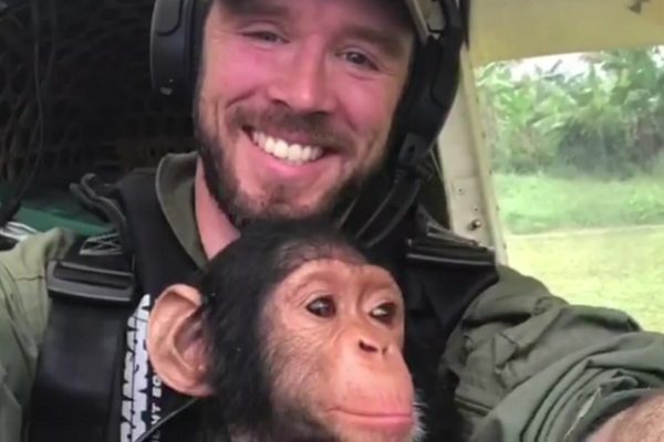 Bebê chimpanzé é resgatado de caçadores e fica ‘amigo’ de piloto de helicóptero